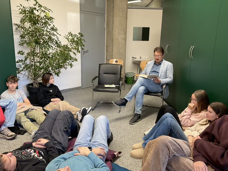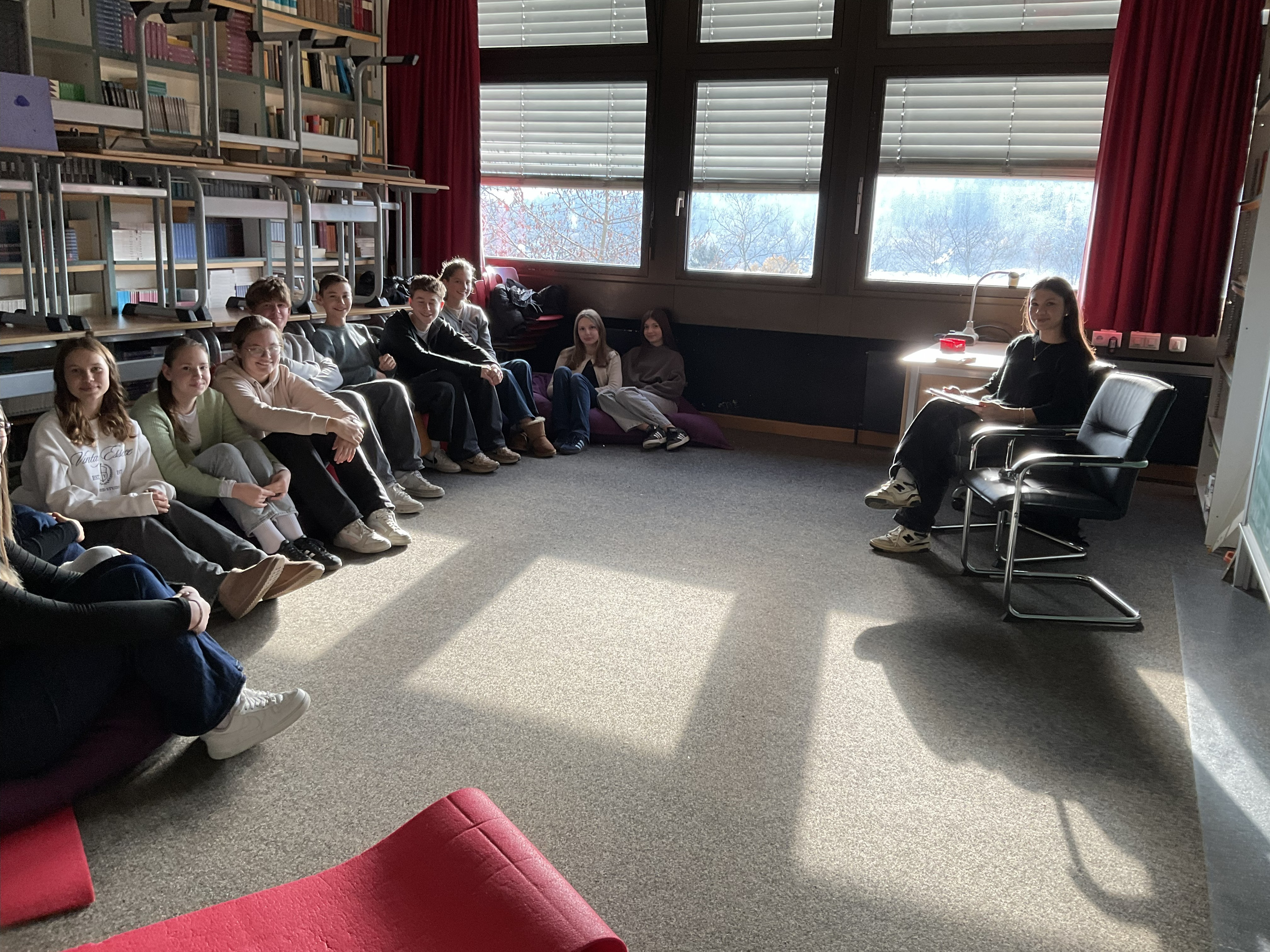 Der Schriftsteller fand schnell Zugang zu den Schülerinnen und Schülern, welche ihm viele Fragen stellten. Zu seinen Hobbys zählen bereits seit seiner Kindheit unter anderem Lesen und Schreiben. Die Ideen stammen vor allem von Theaterstücken, von Kinofilmen oder allgemein von Gehörtem. Meist hat er eine Ursprungsidee, aus der sich dann alles Weitere entwickelt. Der Autor findet es spannend, von einer stabilen Situation auszugehen, die irgendwann kippt. Dann wird der Umgang der Figuren mit dem Unvorhersehbaren, wie zum Beispiel dem Verschwinden des Vaters aus seinem Roman „Wenn man so will, waren es die Aliens“, geschildert. Er interessiert sich dafür, wie ursprünglich intakte Figuren dazu gezwungen werden, sich mit Problemen auseinanderzusetzen. Zu seinen Lieblingsautoren zählen vor allem Christian Kracht oder Thomas Mann. Abschließend gibt er den Schüler/innen den Tipp, Geschichten als etwas Bedeutendes für ihr Leben anzusehen, unabhängig davon, ob man sie liest, hört oder ob sie in einem Film oder einer Serie umgesetzt werden.